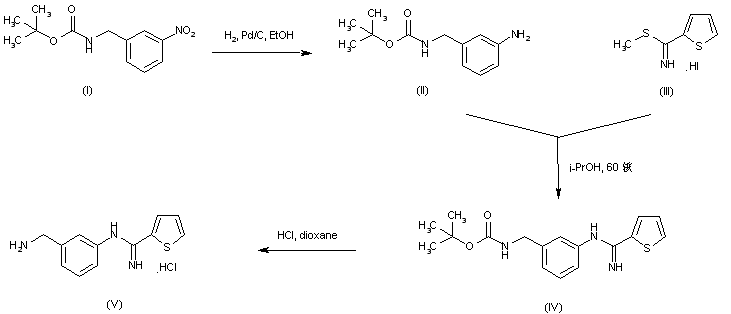 Reduction of N-Boc-3-nitrobenzylamine (I) by catalytic hydrogenation over Pd/C yields aniline (II). This is then condensed with S-methyl-2-thiophenethiocarboximide (III) to furnish amidine (IV). Subsequent acidic Boc group cleavage yields amine (V).