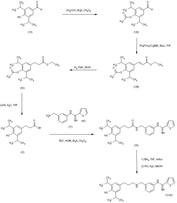 3,5-Diisopropyl-4-hydroxybenzaldehyde (VI) is esterified with acetyl chloride, producing acetate (VII). Subsequent Wittig condensation of aldehyde (VII) with carboethoxymethylene triphenylphosphorane leads to the cinnamyl derivative (VIII), which is further hydrogenated to the arylpropionic ester (IX). After saponification of ester (IX) with LiOH, the resultant carboxylic acid (X) is coupled to amine (V), producing amide (XI). Finally, amide reduction with borane in THF gives rise to the target amine.