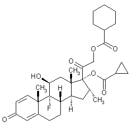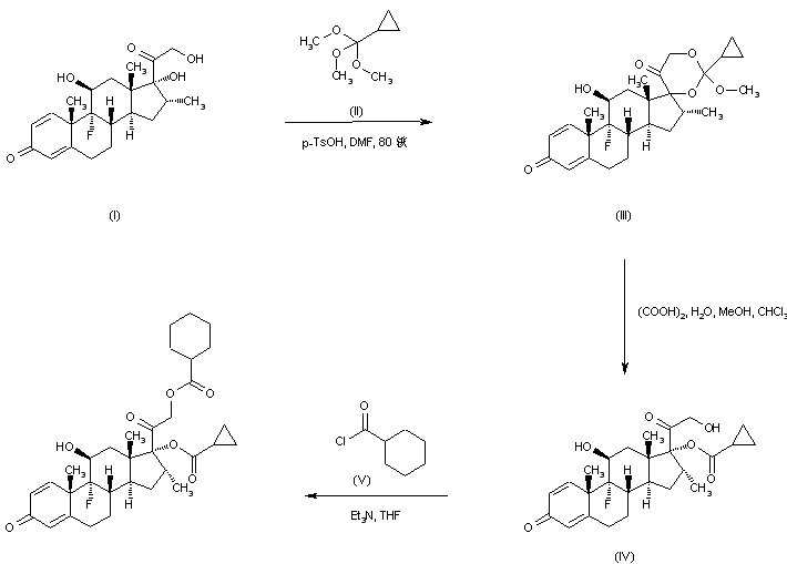 Treatment of dexamethasone (I) with trimethyl orthocyclopropanecarboxylate (II) in the presence of p-toluenesulfonic acid gives the mixed orthoester (III), which, upon acidic hydrolysis with oxalic acid leads to the C-17 cyclopropanecarboxylate ester (IV). Subsequent esterification of (IV) with cyclohexanecarbonyl chloride (V) furnishes the desired dexamethasone diester.