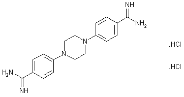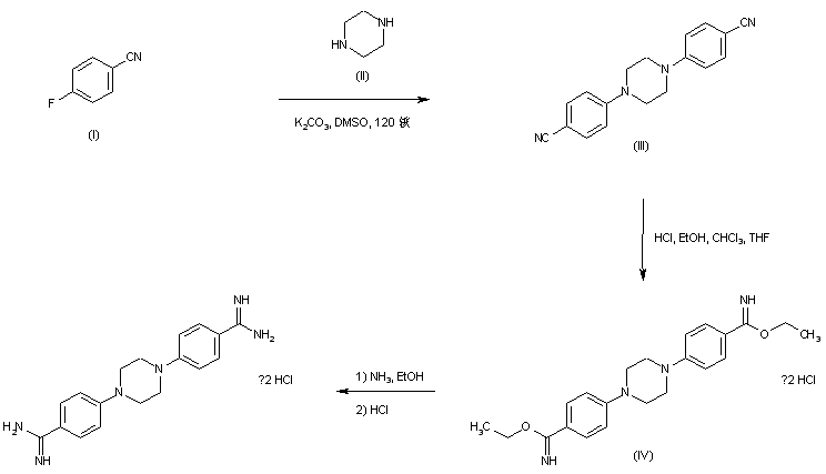 Condensation of 4-fluorobenzonitrile (I) with piperazine (II) in hot DMSO gives rise to the dinitrile adduct (III). This is then converted into imidate (IV) with HCl/EtOH. Treatment of imidate (IV) with ethanolic ammonia furnishes the corresponding bis-amidine derivative, which is finally isolated as the dihydrochloride salt. (1,2)