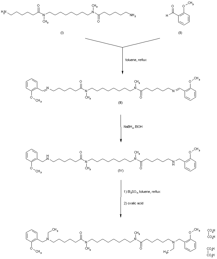 Condensation of diamine (I) with 2-methoxybenzaldehyde (II), followed by NaBH4 reduction of the intermediate bis-imine (III) gives rise to the benzylic amine (IV). This is then alkylated with diethyl sulfate, and the resultant N-ethyl amine is finally isolated as the corresponding dioxalate salt.