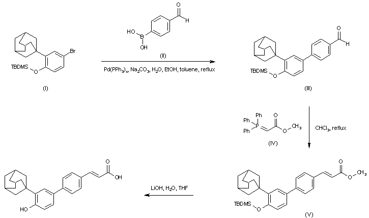 In an alternative method, 4-(t-butyldimethylsilyloxy)-3-(1-adamantyl)bromobenzene (I) undergoes Suzuki coupling with 4-formylbenzeneboronic acid (II) to provide the biphenyl aldehyde (III). Subsequent Wittig condensation of (III) with methyl triphenylphosphoranylideneacetate (IV) yields the unsaturated ester (V). This is finally hydrolyzed with LiOH to furnish the title compound.