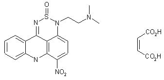 1-Chloro-4-nitro-9,10-dihydroacridin-9-one (I) is refluxed with POCl3 in the presence of a catalytic amount of DMF and subsequently reacted with ammonium carbonate in hot phenol to provide the amino acridine (II). Displacement of the 4-chloro group of (II) with N,N-dimethylethanediamine (III) in DMF at 100 C leads to amine (IV). Cyclization of (IV) with SOCl2 yields the target thiadiazinoacridine, which is finally isolated as the corresponding maleate salt.