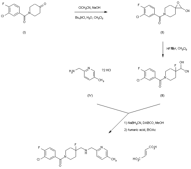 In an alternative, shorter route, 1-(3-chloro-4-fluorobenzoyl)-4-piperidinone (I) is subjected to Darzens condensation with chloroacetonitrile in the presence of NaOH and a phase-transfer catalyst to furnish the epoxy nitrile (II). Epoxide opening in (II) with HF-pyridine gives rise to the fluoro hydroxy nitrile (III). This is finally condensed with (5-methylpyridin-2-yl)methylamine (IV) under reductive amination conditions to produce the title compound.