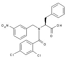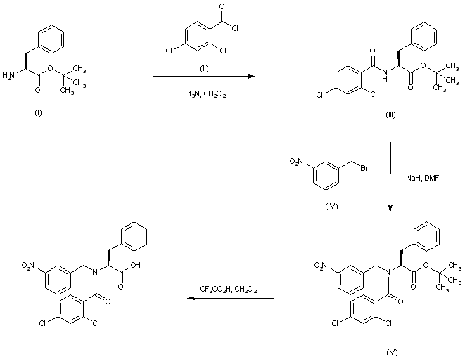 Acylation of L-phenylalanine tert-butyl ester (I) with 2,4-dichlorobenzoyl chloride (II) provides the corresponding amide (III). This is then N-alkylated with 3-nitrobenzyl bromide (IV) in the presence of NaH to yield (V). The tert-butyl ester group of (V) is finally cleaved with trifluoroacetic acid to furnish the target carboxylic acid. (1-3)