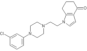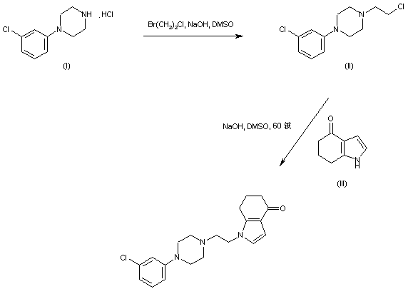 N-(3-Chlorophenyl)piperazine (I) is alkylated with 1-bromo-2-chloroethane in the presence of NaOH in DMSO to afford the (2-chloroethyl)piperazine (II). Subsequent condensation of alkyl chloride (II) with 4,5,6,7-tetrahydro-1H-indol-4-one (III) gives rise to the title compound