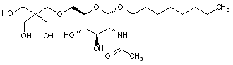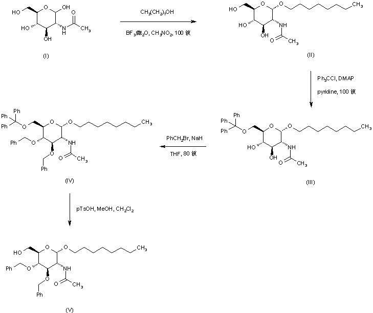 Condensation of N-acetyl-D-glucosamine (I) with n-octanol in the presence of boron trifluoride etherate affords the alpha-glycoside (II). Selective protection of the primary hydroxyl group of (II) with trityl chloride yields the O-trityl derivative (III), which is subsequently reacted with benzyl bromide to furnish the dibenzyl ether (IV). Then, O-trityl group cleavage under acidic conditions gives rise to the primary alcohol (V). (1,2)
