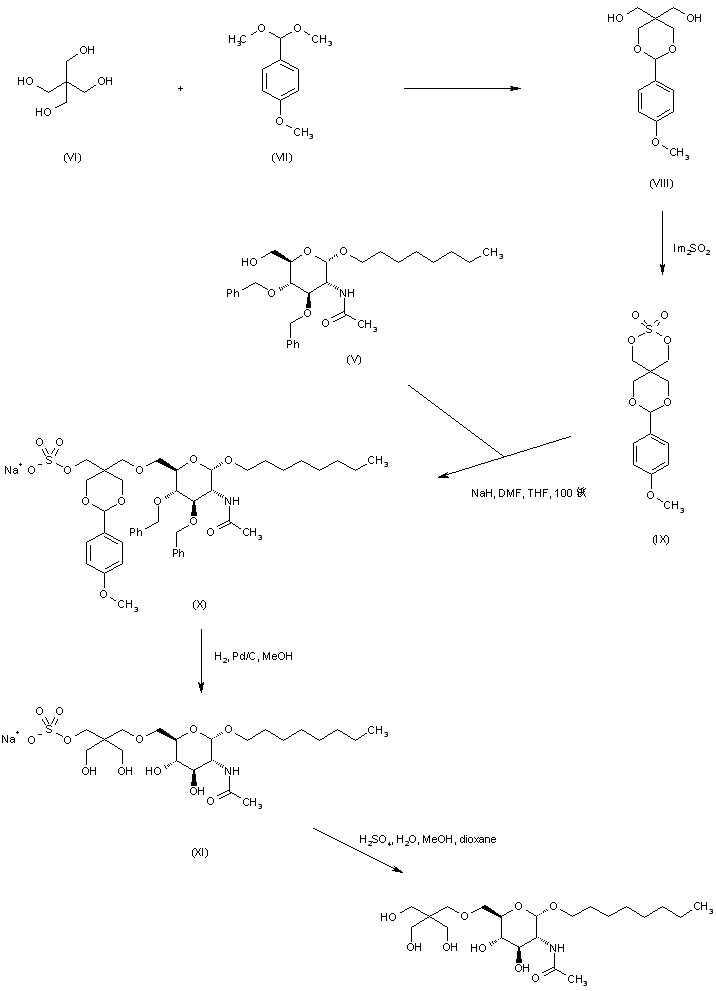 Pentaerythritol (VI) is condensed with anisaldehyde dimethylacetal (VII) to produce the pentaerythritol mono-benzylidene acetal (VIII). Subsequent reaction of diol (VIII) with sulfuryl diimidazole leads to the cyclic sulfate (IX) (1). Alkylation of alcohol (V) with sulfate (IX) in the presence of NaH gives rise to the ether adduct (X). Hydrogenolysis of the benzyl and benzylidene groups of (X) over Pd/C affords (XI). Finally, acid hydrolysis of the sulfate group in (XI) furnishes the target compound. (1,2)
