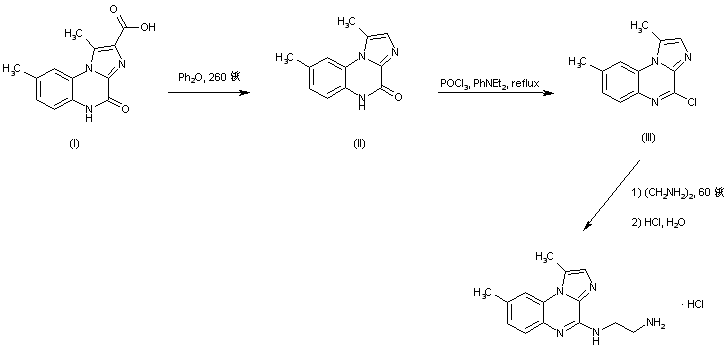 Decarboxylation of the tricyclic carboxylic acid (I) in boiling diphenyl ether leads to (II). This is further chlorinated to (III) employing POCl3 in the presence of N,N-diethylaniline. Then, displacement of chloride (III) with ethylenediamine at 60癈 gives rise to the title compound, which is finally isolated as the corresponding hydrochloride salt.