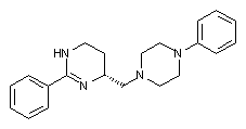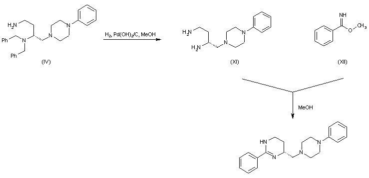 | 合成路线图解说明: The N-benzyl groups of (IV) are removed by hydrogenolysis over Pearlman's catalyst to furnish the deprotected 1,3-diamine (XI). This is finally condensed with methyl benzimidate (XII), giving the target cyclic amidine derivative. |