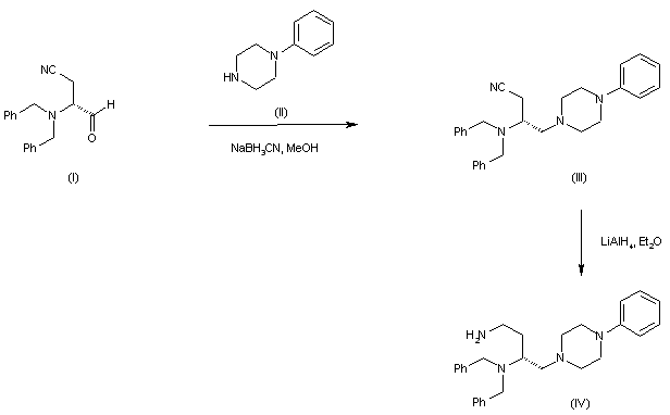 | 合成路线图解说明: The 1,3-diamine precursor (IV) can be prepared by two alternative ways. The chiral aminoaldehyde (I) is reductively aminated with N-phenylpiperazine (II) to furnish (III). Subsequent cyano group reduction in (III) with LiAlH4 leads to intermediate (IV). |