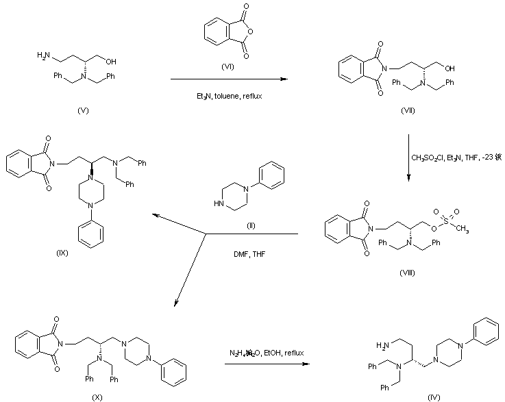 | 合成路线图解说明: Starting from diamino alcohol (V), protection of the primary amino group with phthalic anhydride (VI) produces phthalimide (VII). After conversion of the alcohol function into the corresponding mesylate (VIII), its condensation with N-phenylpiperazine (II) gives rise to the expected compound (X), along with minor amounts of its regioisomer (IX). Subsequent hydrazinolysis of (X) yields the desired primary amine (IV). |