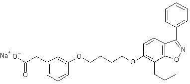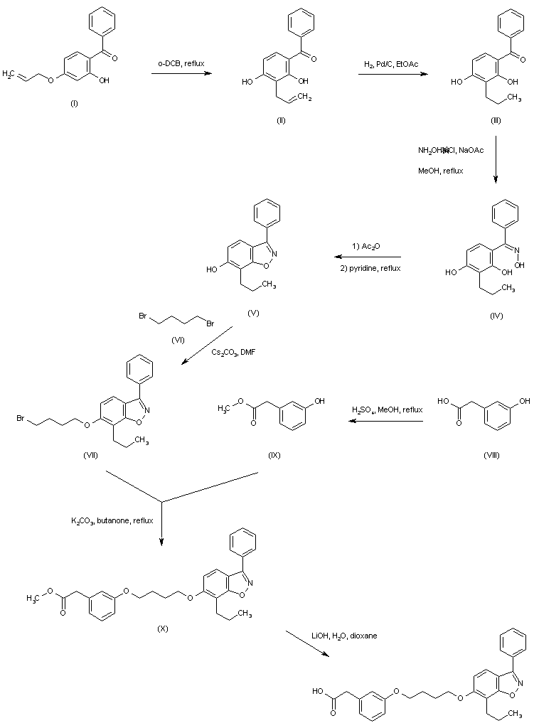 Claisen rearrangement of allyl ether (I) in refluxing o-dichlorobenzene affords (II). The allyl group of (II) is subsequently hydrogenated over Pd/C to provide the propyl derivative (III). Benzophenone (III) is converted into the corresponding oxime (IV) by means of hydroxylamine hydrochloride and NaOAc. Acetylation of oxime (IV), followed by refluxing in pyridine gives rise to the benzisoxazole (V). The phenolic hydroxyl group of (V) is then alkylated by 1,4-dibromobutane (VI) producing the bromobutyl ether (VII). 3-Hydroxyphenylacetic acid (VIII) is esterified with MeOH/H2SO4 to give the methyl ester (IX). This is then condensed with bromide (VII) in the presence of K2CO3 to furnish diether (X). Finally, saponification of the methyl ester group of (X) employing LiOH yields the target carboxylic acid (1,2)