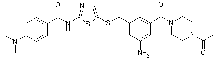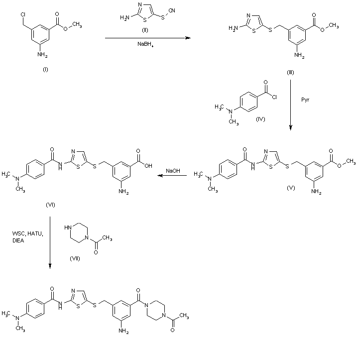 The reductocondensation of 3-amino-5-(chloromethyl)benzoic acid methyl ester (I) with 2-aminothiazol-5-ylisothiocyanate (II) by means of NaBH4 gives the thioether (III), which is condensed with 4-(dimethylamino)benzoyl chloride (IV) by means of pyridine in dichloromethane to yield the amide (V). The hydrolysis of the ester group of (V) with NaOH in methanol affords the corresponding carboxylic acid (VI), which is finally condensed with 1-acetylpiperazine (VII) by means of WSC, HATU and DIEA in THF to provide the target piperazide.
