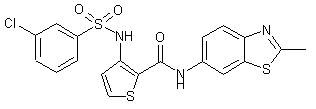 | 合成路线图解说明: Methyl 3-aminothiophene-2-carboxylate (I) is acylated by 3-chlorobenzenesulfonyl chloride (II) to produce sulfonamide (III). After alkaline hydrolysis of the methyl ester group of (III), the resultant carboxylic acid (IV) is chlorinated by means of oxalyl chloride to furnish acid chloride (V). Finally, coupling of acid chloride (V) with 6-amino-2-methylbenzothiazole (VI) yields the title carboxamide. |