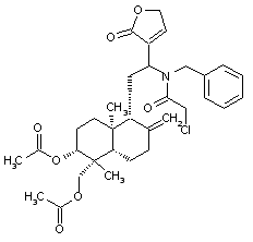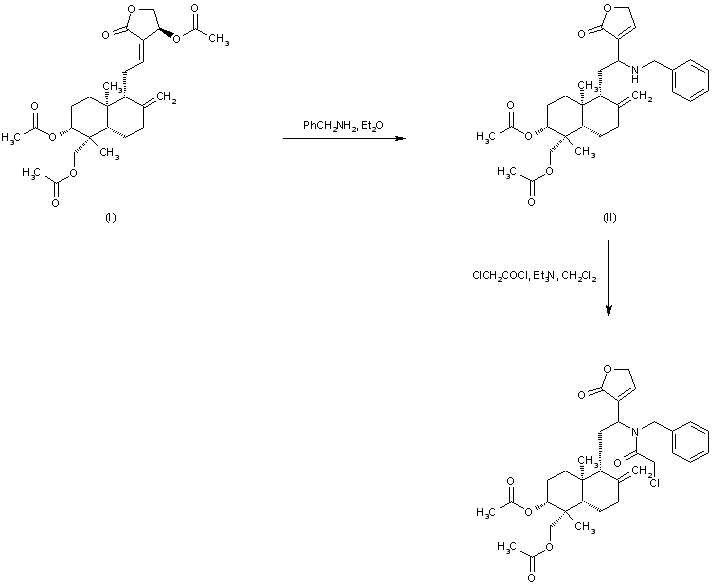 Conjugate addition of benzylamine to 3,14,19-triacetyl andrographolide (I) with concomitant elimination of the 14-acetoxy group leads to the butenolide derivative (II). The amino group of (II) is then acylated by chloroacetyl chloride in the presence of Et3N to produce the title chloroacetamide (1,2)