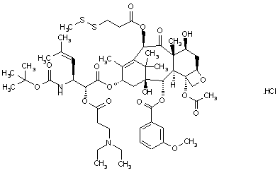 | 合成路线图解说明: Condensation of the modified baccatin (VIII) with beta-lactam (XVII) produces ester (XVIII). Selective cleavage of the secondary acetate ester of (XVIII) is then accomplished with hydrazine hydrate in EtOH to yield (XIX). Alcohol (XIX) is further esterified with 3-(methyldisulfanyl)propionic acid (XX) to afford (XXI). This is finally desilylated with HF in pyridine to provide the title compound. |