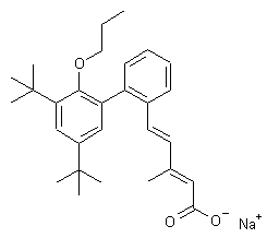 Alkylation of 2,4-di-tert-butyl-6-iodophenol (I) with bromopropane by means of NaH (1) or CsF (2) provides the corresponding propyl ether (II). Subsequent Suzuki coupling of aryl iodide (II) with 2-formylbenzeneboronic acid (III) leads to the biphenyl aldehyde (IV). This is then condensed with phosphonate (V) producing the dienoate ester (VI). Finally, the ethyl ester group of (VI) is hydrolyzed with LiOH to the target carboxylic acid (1,2).