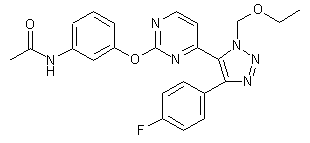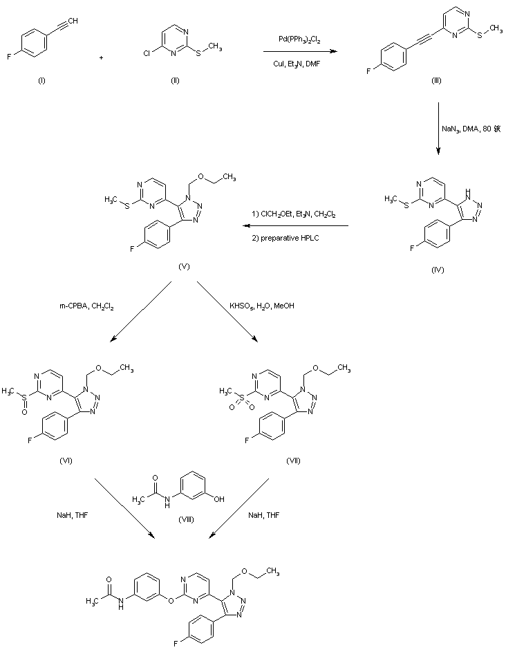 4-Fluorophenylacetylene (I) is coupled to 4-chloro-2-(methylsulfanyl)pyrimidine (II) by means of Pd(PPh3)2Cl2 and CuI to furnish the diaryl acetylene (III). Subsequent condensation of acetylene (III) with sodium azide in hot DMA leads to triazole (IV). Alkylation of (IV) with chloromethyl ethyl ether gives rise to the three possible N-alkylated triazoles, which can be separated by means of preparative HPLC (1,2). The desired regioisomer (V) is then oxidized to sulfoxide (VI) employing m-chloroperbenzoic acid (1). Alternatively, oxone? oxidation of (V) produces the corresponding sulfone (VII) (1,2). Finally, condensation of either sulfoxide (VI) or sulfone (VII) with the sodium salt of m-(acetylamino)phenol (VIII) provides the title compound (1,2).