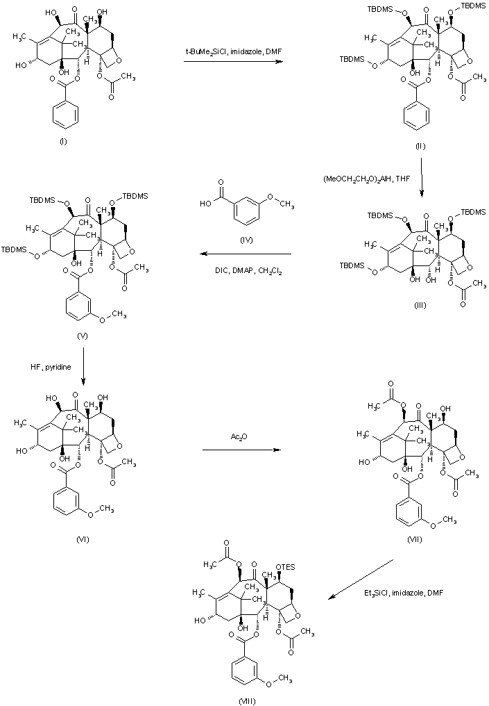 | 合成路线图解说明: Baccatin (I) is protected by silylation at the secondary alcohol groups with tert-butyldimethylsilyl chloride and imidazole to afford the tris-silyl ether (II). Subsequent reductive cleavage of the benzoate ester of (II) by means of bis(methoxyethoxy)aluminum hydride leads to alcohol (III), which is then esterified with m-anisic acid (IV) to furnish (V). Desilylation of (V) employing HF in pyridine leads to tetraol (VI). Selective mono-acetylation of (VI) provides acetate (VII), which is further protected as the silyl ether (VIII) with triethylsilyl chloride and imidazole. |