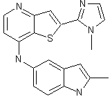 Decarboxylation of methyl 3-aminothiophene-2-carboxylate (I) in 2 N NaOH leads to 3-aminothiophene (II). Meldrum's acid (III) is condensed with triethyl orthoformate to produce the ethoxymethylene derivative (IV). Subsequent reaction of enol ether (IV) with 3-aminothiophene (II) gives rise to enamine (V), which is further cyclized to thienopyridinone (VI) upon heating in dowtherm A at 260 C. This is then chlorinated by means of oxalyl chloride to furnish 4-chlorothieno[3,2-b]pyridine (VII). Metalation of (VII) with butyllithium in cold THF, followed by treatment with I2 affords the aryl iodide (VIII). Palladium-catalyzed coupling of (VIII) with the lithiated derivative of 1-methylimidazole (IX) yields (X). Finally, displacement of the chloride group of (X) with 5-amino-2-methylindole (XI) provides the title compound.