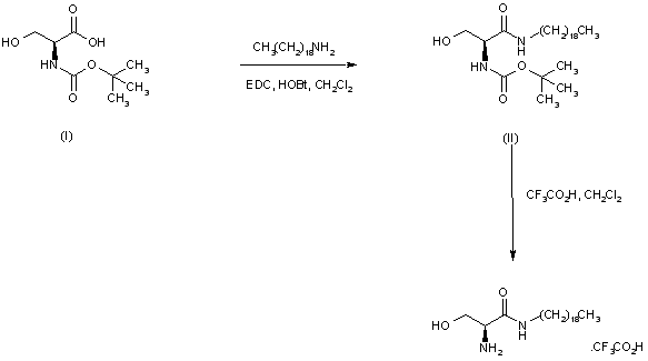 N-Boc-L-Serine (I) is coupled to nonadecyl amine by means of EDC/HOBt, producing the serinamide derivative (II). Subsequent deprotection of the N-Boc group of (II) with trifluoroacetic acid in CH2Cl2 furnishes the required N-nonadecyl serinamide.