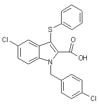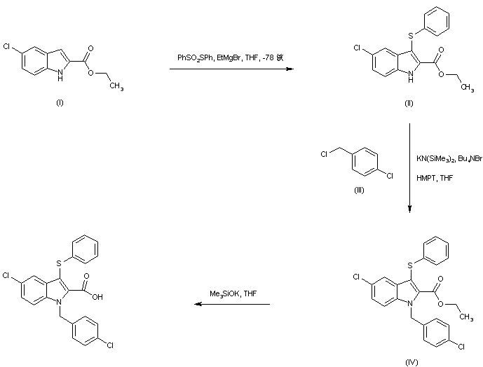 Sulfenylation of the Grignard reagent derived from ethyl 5-chloroindole-2-carboxylate (I) with S-phenyl benzenethiosulfonate affords the 3-phenylsulfanyl indole (II). This is then alkylated with 4-chlorobenzyl chloride (III) in the presence of potassium hexamethyldisilazide to yield the N-benzyl indole derivative (IV). Finally, hydrolysis of ethyl ester (IV) by means of potassium trimethylsilanolate under anhydrous conditions produces the target carboxylic acid (1,2).