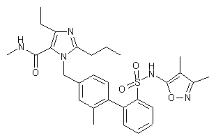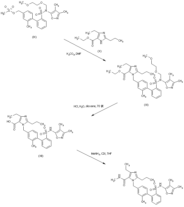 Mesylate (IX) is condensed with ethyl 2-propyl-4-ethylimidazole-5-carboxylate (X) yielding (XI). Simultaneous ester group hydrolysis and MEM group deprotection under acidic conditions gives rise to the imidazolecarboxylic acid (XII). This is finally coupled with methylamine via activation with CDI to produce the desired N-methyl carboxamide (1-3).