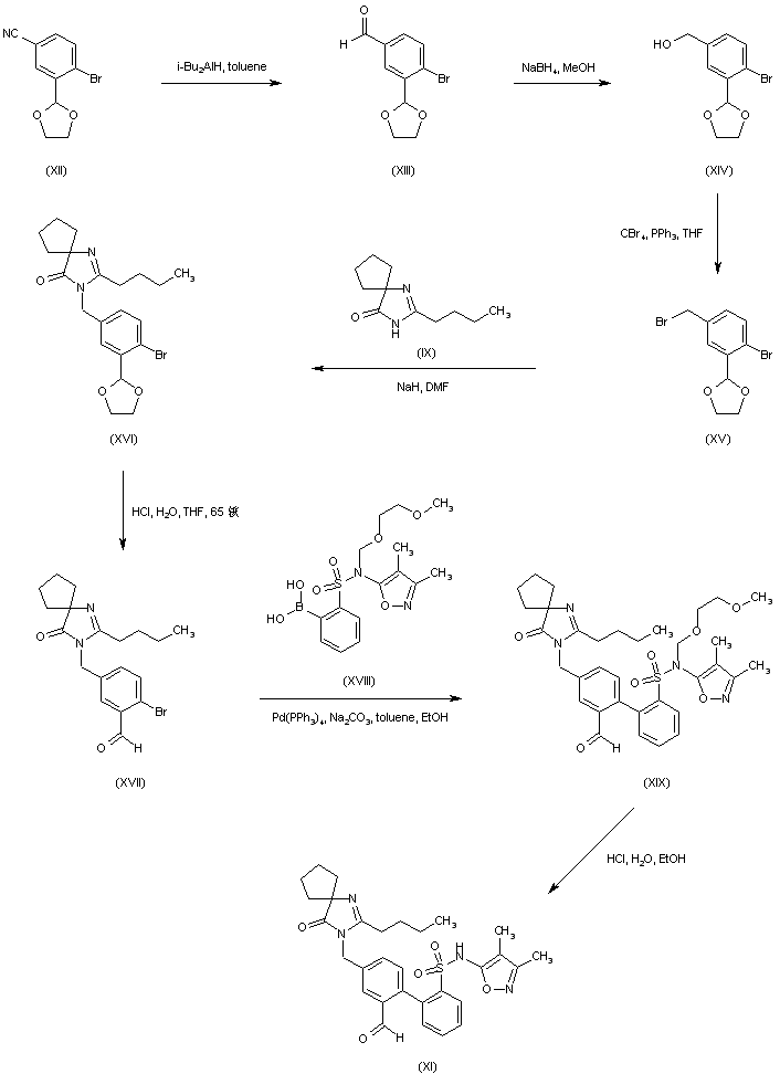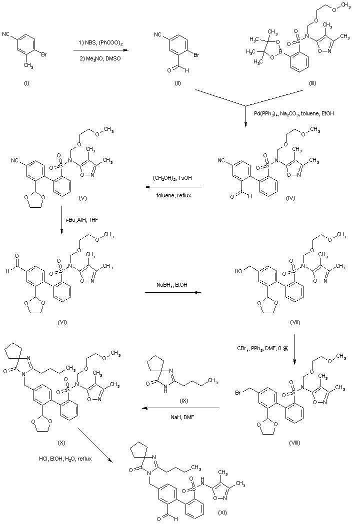 The intermediate biphenyl aldehyde (XI) is prepared by two related methods. 4-Bromo-3-methylbenzonitrile (I) is oxidized to aldehyde (II) via radical bromination with N-bromosuccinimide/benzoyl peroxide, followed by treatment with trimethylamine N-oxide. Suzuki coupling of aryl bromide (II) with the pinacol boronate (III) affords biphenyl (IV). After protection of the aldehyde moiety of (IV) as the corresponding ethylene ketal (V), its cyano group is reduced to aldehyde (VI) employing DIBAL in THF. Subsequent reduction of (VI) with NaBH4 leads to alcohol (VII), which is further converted into the benzyl bromide (VIII) by means of CBr4/PPh3. Bromide (VIII) is condensed with the spiro imidazolone (IX) in the presence of NaH, to produce (X). Then acidic hydrolysis of the ethylene ketal and SEM groups of (X) gives rise to the intermediate aldehyde (XI)