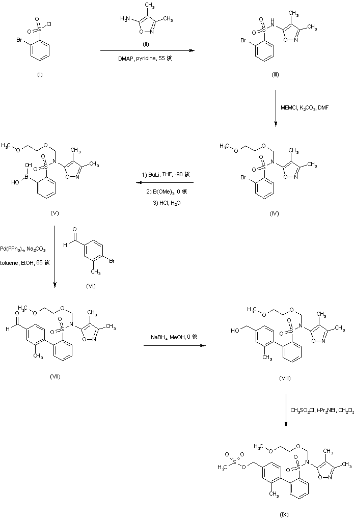 Coupling of 2-bromobenzenesulfonyl chloride (I) with 5-amino-3,4-dimethylisoxazole (II) affords sulfonamide (III), which is further protected as the N-methoxyethoxymethyl derivative (IV) employing MEM-chloride in DMF. Lithiation of bromosulfonamide (IV), followed by treatment with trimethyl borate and acidic work up leads to the boronic acid intermediate (V). This is then subjected to Suzuki coupling with 4-bromo-3-methylbenzaldehyde (VI) to yield the biphenyl adduct (VII). After reduction of aldehyde (VII) to the benzylic alcohol (VIII) with NaBH4, reaction with methanesulfonyl chloride and diisopropylethylamine gives rise to the mesylate (IX) (1-3).