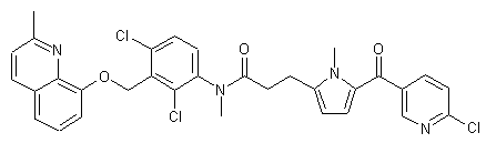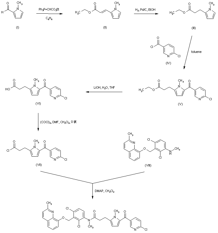 Wittig reaction of 1-methylpyrrole-2-carboxaldehyde (I) with (ethoxycarbonylmethylene)triphenylphosphorane furnishes the pyrrolylacrylate ester (II), which is subsequently hydrogenated over Pd/C to the pyrrolylpropionate (III). Friedel-Crafts acylation of pyrrole (III) with 6-chloronicotinoyl chloride (IV) gives rise to the pyrrolyl ketone (V). After alkaline hydrolysis of the ethyl ester group of (V), the resultant carboxylic acid (VI) is converted into the corresponding acid chloride (VII) employing oxalyl chloride and DMF. Finally, coupling of acid chloride (VII) with the known aniline derivative (VIII) leads to the desired amide.