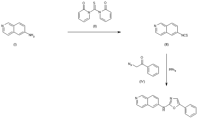 Treatment of 6-aminoisoquinoline (I) with 1,1'-thiocarbonyldi-2(1H)-pyridone (II) provides the isothiocyanate (III). Subsequent condensation of (III) with 2-azidoacetophenone (IV) in the presence of triphenylphosphine affords the title oxazole derivative.