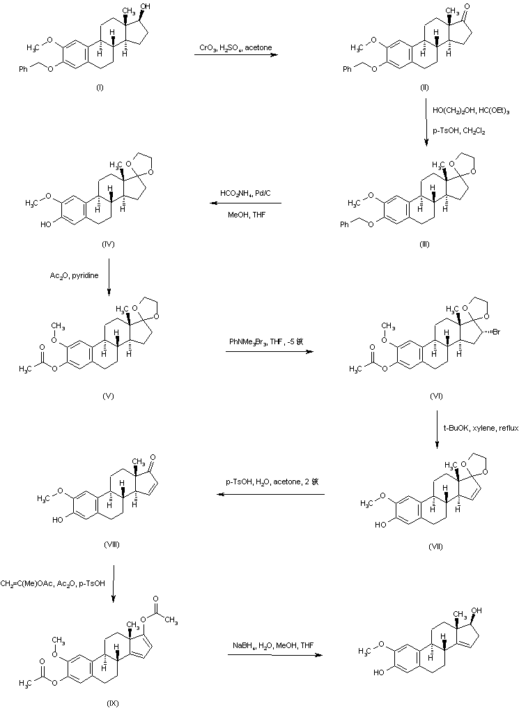 The known 17-hydroxy steroid (I) is oxidized to the corresponding ketone (II) by means of the Jones reagent in acetone. After protection of the ketone (II) as the ethylidene ketal (III), removal of the 3-benzyl ether under transfer hydrogenation conditions furnishes the phenol (IV), which is esterified with acetic anhydride in pyridine to give the aryl acetate (V). Bromination at the alpha-position of the ketalized keto group of (V) is carried out in the presence of phenyltrimethylammonium tribromide in cold THF to produce the 16-alpha-bromide (VI). Dehydrobromination of (VI) with simultaneous acetate hydrolysis upon treatment with potassium tert-butoxide leads to the olefin (VII). Subsequent acidic hydrolysis of ketal (VII) gives the enone (VIII), which is further acylated with isopropenyl acetate and acetic anhydride in the presence of p-toluenesulfonic acid to furnish the dienyl acetate (IX). Finally, reductive treatment of (IX) with sodium borohydride affords the target diol.