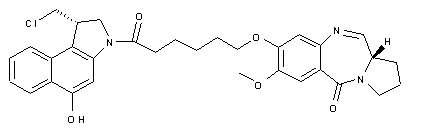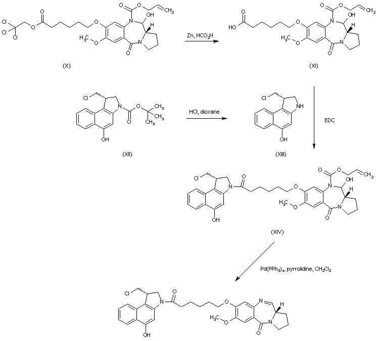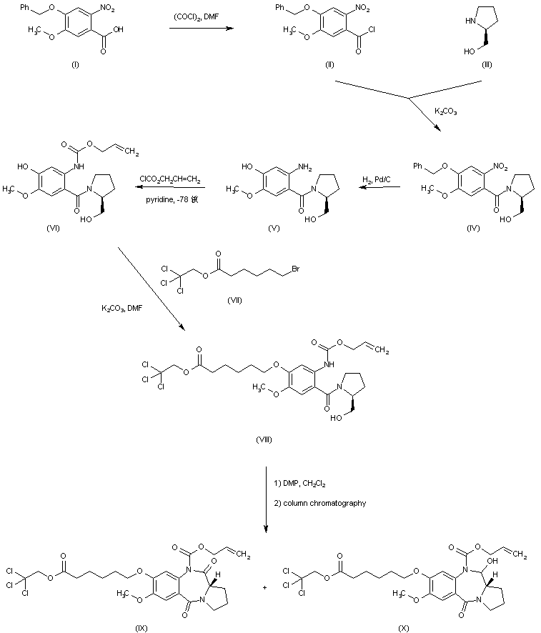 4-Benzyloxy-5-methoxy-2-nitrobenzoic acid (I) is treated with oxalyl chloride to provide the corresponding acid chloride (II), which is subsequently coupled with (S)-2-pyrrolidinemethanol (III) to give amide (IV). Hydrogenation of (IV) over Pd/C removes the benzyl protecting group and reduces the nitro substituent to the amino benzamide (V). Reaction of the aniline (V) with allyl chloroformate affords the carbamate (VI). The phenolic hydroxyl of (VI) is alkylated with trichloroethyl 6-bromohexanoate (VII) to yield (VIII). Dess-Martin oxidation of the primary alcohol group of (VIII) with concomitant intramolecular cyclization leads to the desired pyrrolobenodiazepine (X) together with the overoxidized dione (IX), which can be separated by column chromatography.