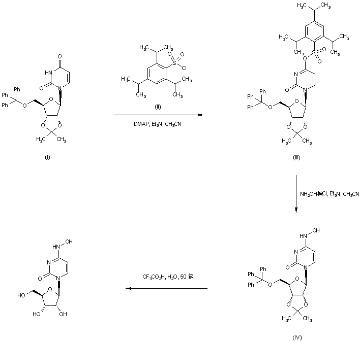 | 合成路线图解说明: Treatment of 2',3'-O-isopropylidene-5'-O-trityluridine (I) with 2,4,6-triisopropylbenzenesulfonyl chloride (II) in the presence of DMAP affords the sulfonic ester derivative (III). Subsequent displacement of sulfonate (III) with hydroxylamine leads to the protected N-hydroxycytidine (IV). The protecting groups of (IV) are finally removed with aqueous trifluoroacetic acid to furnish the title compound. |
