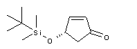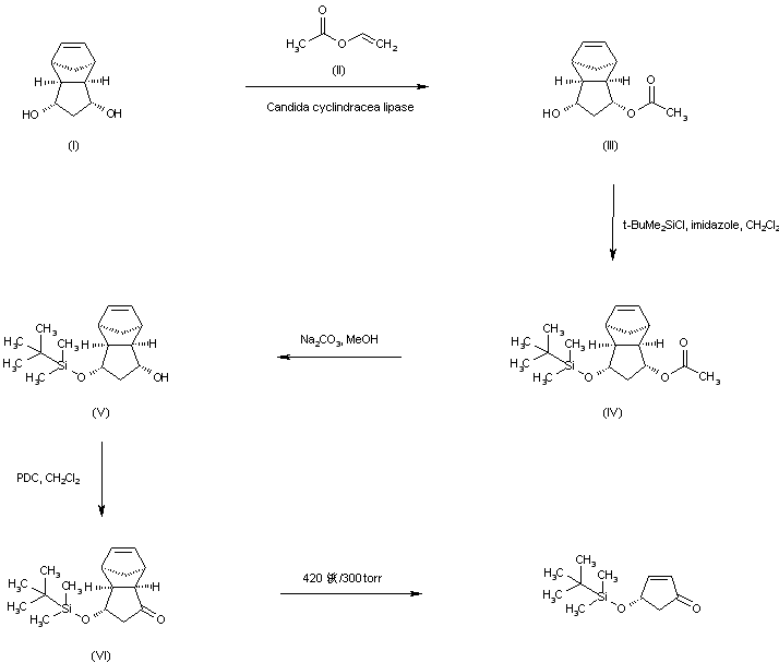 Enantioselective enzyme-catalyzed transesterification of the tricyclic diol (I) with vinyl acetate (II) provides the chiral monoacetate (III). After protection of the free hydroxyl group of (III) as the tert-butyldimethylsilyl ether (IV), alkaline hydrolysis of the acetate ester group yields alcohol (V), which is then oxidized to the corresponding ketone (VI) by means of pyridinium dichromate. Finally, thermal retro-Diels-Alder reaction of (VI) under diminished pressure furnishes the target cyclopentenone derivative.