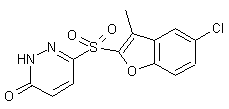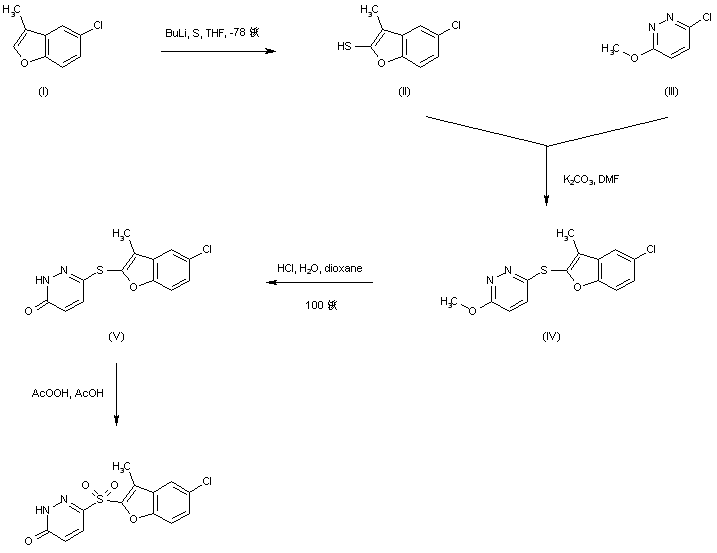 The title sulfone derivative is prepared by two alternative methods. Addition of sulfur to the lithio derivative of 5-chloro-3-methylbenzofuran (I) affords thiol (II). Further condensation of (II) with 3-chloro-6-methoxypyridazine (III) yields sulfide (IV). Acidic hydrolysis of methoxypyridazine (IV) leads to pyridazinone (V). The sulfide group of (V) is finally oxidized to the required sulfone employing an AcOH solution of peracetic acid. (1,2)