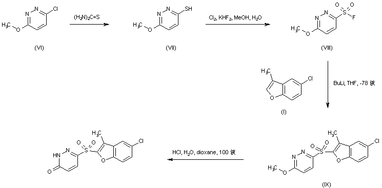Alternatively, 3-chloro-6-methoxypyridazine (VI) is converted into the pyridazine thiol (VII) via reaction with thiourea in butanone. Oxidation of thiol (VII) with chlorine in the presence of potassium bifluoride leads to 4-methoxypyridazine-3-sulfonyl fluoride (VIII) (3). The lithio derivative of 5-chloro-3-methylbenzofuran (I) is then condensed with sulfonyl fluoride (VIII) to produce sulfone (IX). Finally, acidic hydrolysis of the methoxypyridazine group of (IX) gives rise to the corresponding pyridazinone compound (1-3).