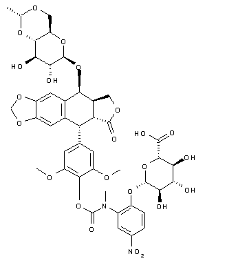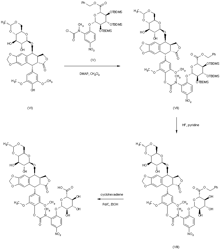 Reaction of etoposide (VI) with acid chloride (V) produces the carbamate adduct (VII). The silyl protecting groups of (VII) are then removed by treatment with HF-pyridine yielding triol (VIII). Finally, the benzyl ester function of (VIII) is deprotected by transfer hydrogenolysis in the presence of cyclohexadiene and Pd/C. (1,2)