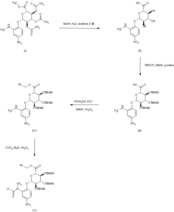 The protected glucuronic acid derivative (I) is hydrolyzed under alkaline conditions to furnish (II). The alcoholic hydroxyl groups of (II) are subsequently protected as the silyl ether (III) employing t-butyldimethylsilyl triflate in the presence of DMAP. The carboxyl group of (III) is further converted to the corresponding benzyl ester (IV) by DCC-mediated coupling with benzyl alcohol. Acylation of amine (IV) with phosgene leads to the carbamyl chloride (V). (1,2)