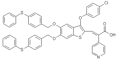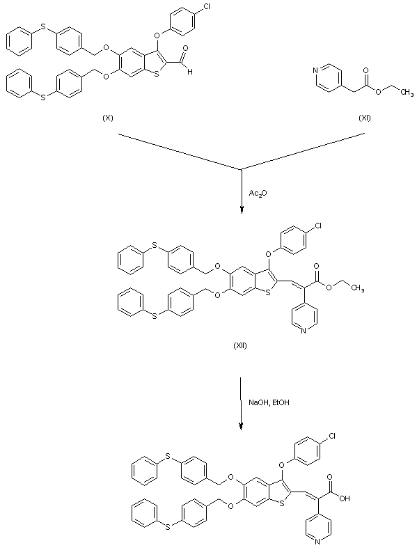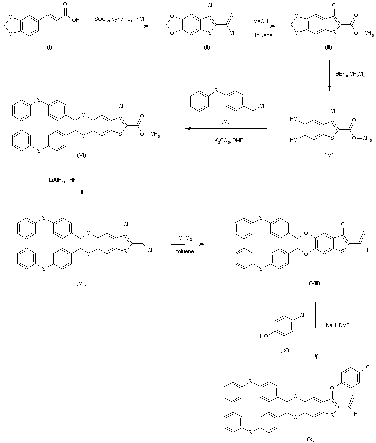 Treatment of 3,4-methylenedioxycinnamic acid (I) with thionyl chloride and pyridine gives the benzothiophene-2-carbonyl chloride (II), which is reacted with methanol in toluene to produce the methyl ester (III). Cleavage of the methylenedioxy group of (III) with BBr3 affords the dihydroxy derivative (IV), which upon alkylation with 4-(phenylsulfanyl)benzyl chloride (V) yields the diether derivative (VI). The ester function of (VI) is then reduced by LiAlH4 to the primary alcohol (VII), which is further oxidized to aldehyde (VIII) by means of MnO2 in toluene. Substitution of the chlorine atom of (VIII) with 4-chlorophenol (IX) in the presence of NaH furnishes the chlorophenyl ether (X).