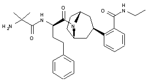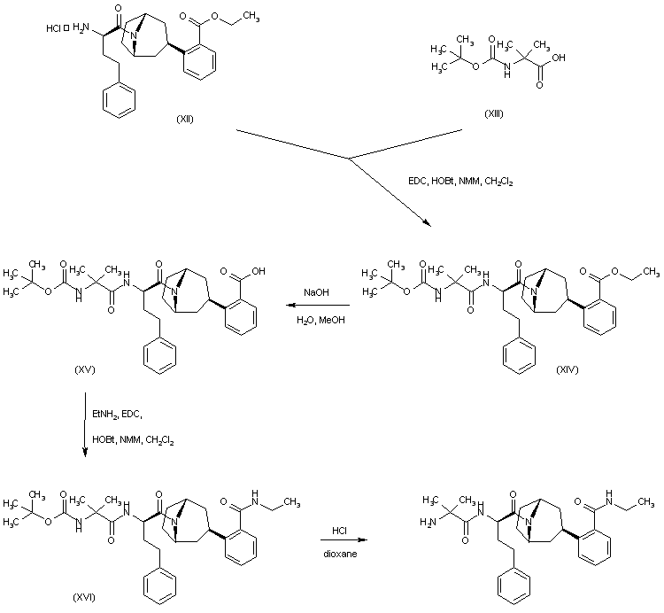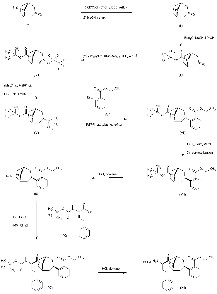 Demethylation of tropinone (I) by means of 1-chloroethyl chloroformate, followed by protection of the resultant secondary amine (II) with di-tert-butyl dicarbonate, leads to the N-Boc derivative (III). Treatment of the potassium enolate of (III) with N-phenyl trifluoromethanesulfonimide produces the vinyl triflate (IV), which is then converted to the stannyl derivative (V) upon treatment with hexamethylditin and palladium catalyst. Stille coupling of (V) with ethyl 2-bromobenzoate (VI) affords (VII). After catalytic double bond hydrogenation of (VII), the resultant mixture of diastereoisomers is separated by recrystallization from hexane/ethyl acetate to give (VIII). The N-Boc protecting group of (VIII) is cleaved with HCl in dioxane to yield amine (IX), which is then coupled with N-Boc-D-benzylalanine (X) to furnish amide (XI). Subsequent acidic Boc-group cleavage gives rise to the amine (XII).