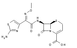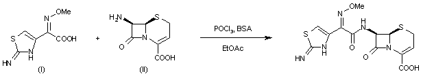 By condesation of 2-methoxyimino-2-(2-amino-1,3-thiazol-4-yl)acetic acid (I) with 7-aminocephalosporanic acid (II) by means of POCl3 and bistrimethylsilylacetamide (BSA) in ethyl acetate.
