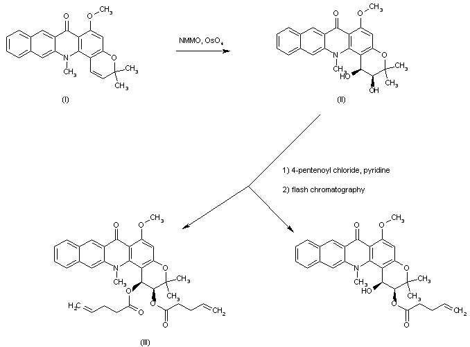 Dihydroxylation of the benzo[b]pyrano[3,2-h]acridinone derivative (I) by means of N-methylmorpholine-N-oxide in the presence of OsO4 leads to the cis-diol (II), which upon esterification with 4-pentenoyl chloride in pyridine furnishes a mixture of diester (III) and the title mono-pentenoate ester, which can be separated employing flash chromatography.