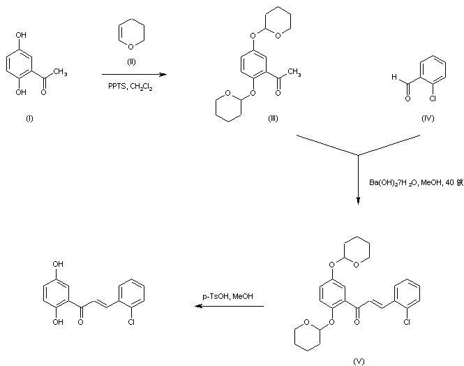 Reaction of 2',5'-dihydroxyacetophenone (I) with dihydropyran (II) and pyridinium p-toluenesulfonate gives the protected bis-tetrahydropyranyl ether (III), which is submitted to Claisen-Schmidt condensation with 2-chlorobenzaldehyde (IV) in the presence of barium hydroxide, yielding the chalcone (V). Finally, the tetrahydropyranyl protecting groups of (V) are removed by acidic hydrolysis with p-toluenesulfonic acid in MeOH.