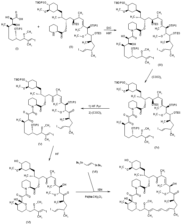 The total synthesis of rapamycin has been performed by initial condensation of two previously synthesized intermediates, the carboxylic acid (I) (scheme 17565203b) and the piperidine (II) (scheme 17565203c), by means of diisopropylcarbodiimide (DIC) and 1-hydroxybenzotriazole (HBT) in dichloromethane to the acylated piperidine (III). The two free hydroxyl groups of (III) are oxidized with oxalyl chloride in DMSO/dichloromethane to the triketone (IV), which is selectively deprotected with HF - pyridine in THF and oxidized again with oxalyl chloride to the hexacarbonyl compound (V). The full deprotection of (V) with HF in acetonitrile produces the simultaneous cyclization of the tetrahydropyran ring, yielding (VI), which is finally cyclized to rapamycin with the distannane (VII) by means of diisopropylethylamine (IEN) and palladium dichloride acetonitrile complex in DMF/THF. (1,2)