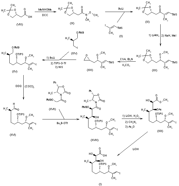 The intermediates (I) and (II) are synthesized as follows: Intermediate (I): The carboxylic acid (VIII) is condensed with N-methoxy-N-methylamine by means of dicyclohexylcarbodiimide (DCC) in dichloromethane to the amide (IX), which is treated with the vinyl iodide (X) and butyllithium in ethyl ether to yield the ketone (XI). The reduction of (XI) with LiAlH4 followed by methylation with MeI and NaH in DMF affords the methoxy compound (XII), which by treatment with camphorsulfonic acid (CSA), triethylamine and K2CO3 in methanol is converted to the epoxide (XIII). The condensation of (XIII) with the iodo ether (XIV) by means of butyllithium followed by silylation with triisopropylsilyl trifluoromethanesulfonate in dichloromethane and iodination with N-iodosuccinimide (NIS) in THF gives the protected triol (XV), which is selectively oxidized with 2,3-dichloro-5,6-dicyano-1,4-benzoquinone (DDQ) and oxalyl chloride in DMSO/dichloromethane, yielding the aldehyde (XVI). The condensation of (XVI) with the oxazolidinone (XVII) by means of tributylboron trifluoromethanesulfonate in toluene/dichloromethane affords compound (XVIII), which is treated with LiOH and H2O2 in THF/water. The resulting free acid is methylated with diazomethane, and the free hydroxyl group is acetylated with acetic anhydride to the acetoxy ester (XIX). Finally, (XIX) is hydrolyzed with LiOH in methanol/water to afford intermediate (I) (see A.D. Piscopio et al., J Chem Soc Chem Commun 1993, 7: 617). (1,2)
