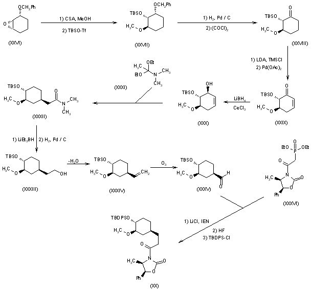 The new intermediates, the oxazolidinone (XX) and the aldehyde (XXI), are obtained as follows: Oxazolidinone (XX): The ring opening of cyclohexane epoxide (XXVI) with methanol and CSA followed by silylation with tert-butyldimethylsilyl trifluoromethanesulfonate in dichloromethane gives compound (XXVII), which is debenzylated by hydrogenolysis and oxidized with oxalyl chloride to the cyclohexanone (XXVIII). Dehydrogenation of (XXVIII) by treatment with lithium diiosopropylamide (LDA), tosyl chloride and palladium diacetate yields the cyclohexenone (XXIX), which is reduced with LiBH4 - CeCl3 in methanol/THF to the cyclohexenol (XXX). The condensation of (XXX) with dimethylacetamide diethylacetal (XXXI) in refluxing xylene affords the cyclohexylacetamide (XXXII), which is reduced with lithium triethylborohydride in THF and with H2 over Pd/C in ethanol to give the cyclohexylethanol (XXXIII). The dehydration of (XXXIII) through a selenium derivative yields the vinyl compound (XXXIV), which is oxidized with ozone to the aldehyde (XXXV). Finally, the condensation of (XXXV) with the phosphonate (XXXVI) by means of IEN and LiCl in acetonitrile followed by a desilylation with HF and silylation with tert-butyldiphenylsilyl chloride in DMF yields the oxazolidinone (XX) (see K.C. Nicolau et al., J Chem Soc Chem Commun 1993, 7: 619). (1,2)