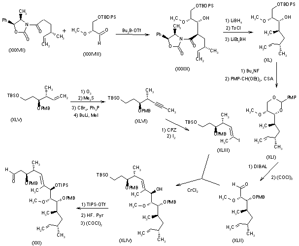 Aldehyde (XXI): The condensation of oxazolidinone (XXXVII) with aldehyde (XXXVIII) by means of dibutylboron trifluoromethanesulfonate in dichloromethane gives compound (XXXIX), which is reduced with LiBH4, tosyl chloride and lithium triethylborohydride as before, yielding the alcohol (XL). The deprotection of (XL) with tetrabutylammonium fluoride in THF followed by formation of a dioxane ring with p-methoxybenzaldehyde diethyl acetal and CSA in dichloromethane affords compound (XLI), which is submitted to a reductive ring opening with diiosbutylaluminum hydride in dichloromethane, followed by an oxidation with oxalyl chloride in DMSO/dichloromethane, yielding the aldehyde (XLII). The condensation of (XLII) with the unsaturated iodo compound (XLIII) by means of CrCl2 in DMSO gives the hydroxy derivative (XLIV), which is finally silylated with triisopropylsilyl trifluoromethanesulfonate in dichloromethane, selectively desilylated with HF - pyridine and oxidized with oxalyl chloride in DMSO/dichloromethane to the intermediate aldehyde (XXI) (see K.C. Nicolau et al., J Chem Soc Chem Commun 1993, 7: 619). The intermediate (XLIII) is prepared by ozonolysis of the protected unsaturated diol (XLV), followed by reaction with dimethylsulfide and tetrabromomethane - triphenylphosphine to obtain an acetylenic intermediate, which is methylated with butyllithium and methyl iodide to the acetylene (XLVI). Finally, this compound is iodinated with iodine and (cyclopentadienyl)2ZrHCl in dichloromethane to the intermediate (XLIII) (see K.C. Nicolau et al., J Chem Soc Chem Commun 1993, 7: 619). (1,2)