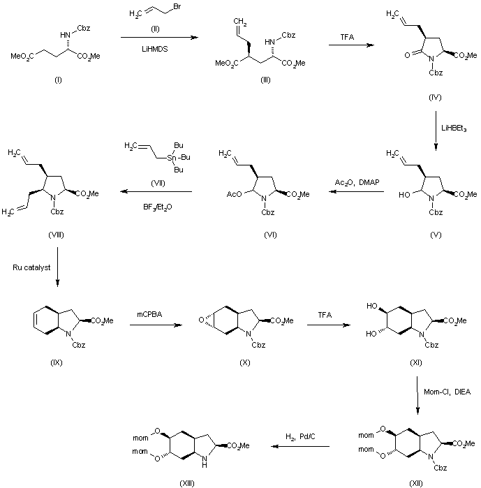 Synthesis of the perhydroindole intermediate (XIII): The alkylation of the N-protected glutamate (I) with allyl bromide (II) by means of LiHMDS in THF gives the protected chiral allyl glutamate (III) (1), which is cyclized by means of TFA in dichloromethane to yield the pyroglutamate (IV). The reduction of (IV) with LiHBEt3 in THF affords the hydroxy compound (V), which is treated with Ac2O and DMAP in dichloromethane to provide the expected hemiaminal derivative (VI). The reaction of (VI) with allyl tributylstannane (VII) by means of BF3/Et2O in toluene gives the diallyl pyrrolidine (VIII), which is submitted to a ring closure by olefin metathesis using a Grubbs Ru catalyst in dichloromethane to yield the hexahydroindole derivative (IX). The reaction of (IX) with mCPBA in dichloromethane affords the epoxide (X), which is hydrolyzed with TFA to yield the dihydroxy compound (XI). The reaction of (XI) with Mom-Cl and DIEA in dichloromethane provides the bis mom ether (XII), which is treated with H2 over Pd/C in methanol to yield the desired perhydroindole intermediate (XIII) (2).